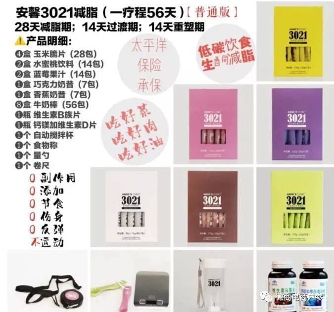 最近两年,打着“减肥”等旗号在微商渠道中违规宣传的普通食品并不少见,微商渠道上种种乱象也随着媒体的曝光而越来越受到外界关注。那么,声名在外的“安馨3021”方案内的产品又是否也是其中的一分子呢?