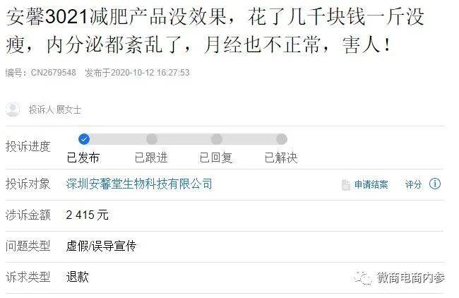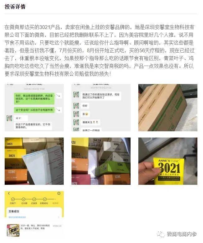 2020年10月,展女士在聚投诉平台上投诉“安馨3021减肥产品没效果,花了几千块钱一斤没瘦,内分泌都紊乱了,月经也不正常,害人!”,具体内容为:在微商那边买的3021产品,卖家在闲鱼上挂的安馨品牌的,她是深圳安馨堂生物科技有限公司下面的微商,目前已经把我删除联系不上了,因为美容院里好几个人推,说不用节食不用运动,只要吃这个就能瘦,还说给你什么指导啊、顾问啊啥的,其实这些都是套路,但是当初我不懂,7月份买的,8月份开始正式吃,买的56天疗程的,现在已经过去了,体重根本没啥变化,如果按那个指导那么吃的话跟节食有啥区别,青菜叶子、鸡胸肉吃吃这些吃久了当然会瘦,难道我是来交智商税的吗,产品一点效果也没有。所以展女士要求深圳安馨堂生物科技有限公司赔偿其
