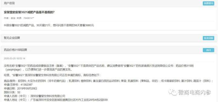 药品价格315网也曾不止一次地接受过网友关于该产品的咨询,并回复道:“安馨 3021”的商标注册信息对应的商品/服务为软饮料; 大豆为主的饮料(非牛奶替代品); 乳清饮料; 植物饮料; 富含蛋白质的运动饮料; 果昔; 乳酸饮料(果制品,非奶); 低卡路里软饮料; 姜汁饮料; 蔬菜汁(饮料)。固体饮料是普通预包装食品的一个分类,只要是名称中写了“固体饮料”的一般不会是药品或保健食品,而属于普通食品。“安馨3021玉米脆片早餐粉固体饮料”、“安馨3021水蜜桃果味固体饮料”和“安馨3021巧克力奶昔固体饮料”可能属于普通食品,既不是药品也不是保健食品,没有具体的保健功能或治疗功效,请消费者谨慎选择。建议消费者选择正规药品或保健食品用于减肥。