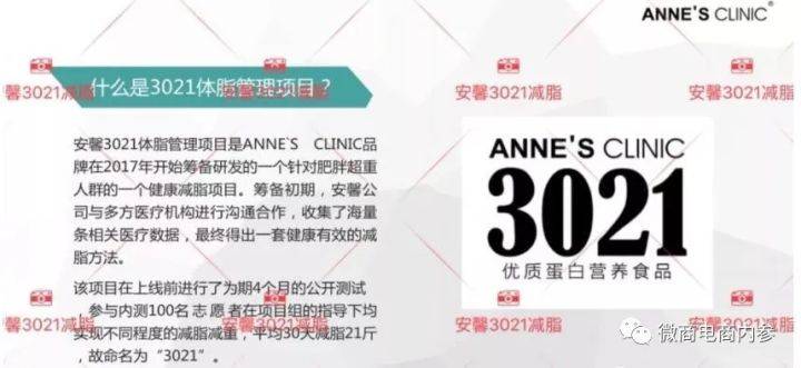 在本篇报道中,我们大致地了解到了“安馨3021”的减肥功效是否可靠,以及安馨微商的背景和发展历程,在下篇报道中,我们将关注的是安馨旗下消毒产品和化妆品的现状,以及其奖金制度有何特色,请继续关注微商电商内参。