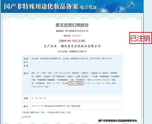 在国家食品药品监督管理局网站上,记者查阅到麦吉丽贵妇美颜膏的备案信息有3个,其中两个备案已经注销。在注销的2个备案信息中均有DMDM 乙内酰脲成分,而记者查询到DMDM乙内酰脲是一种甲醛缓释体防腐剂,主要是通过在化妆品中非常缓慢地释放出极少量的游离甲醛,制造出微生物不适应的环境,借此达到防腐的效果,从而使化妆品免受微生物破坏,长期使用会出现过敏等症状及皮肤的老化现象,导致机体免疫力的下降。但在最新的备案信息上,看到已经采用了“苯氧乙醇”做防腐体系。