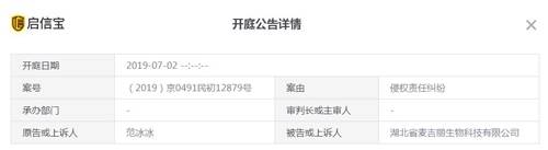 启信宝显示,2019年,因侵权责任纠纷,麦吉丽被范冰冰告上法庭,开庭日期定在7月2日。