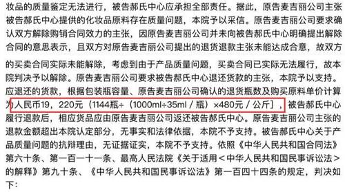 麦吉丽起诉北京郝氏要求退款,据裁判文书显示,北京郝氏应向麦吉丽退还货款,也正因于此,麦吉丽的成本信息得以公之于众:麦吉丽的问题产品有1144瓶,每瓶产品的料体为35ml,每公斤的料体480元,原料的采购价格为19220元,折合每瓶料体的成本为16.8元。