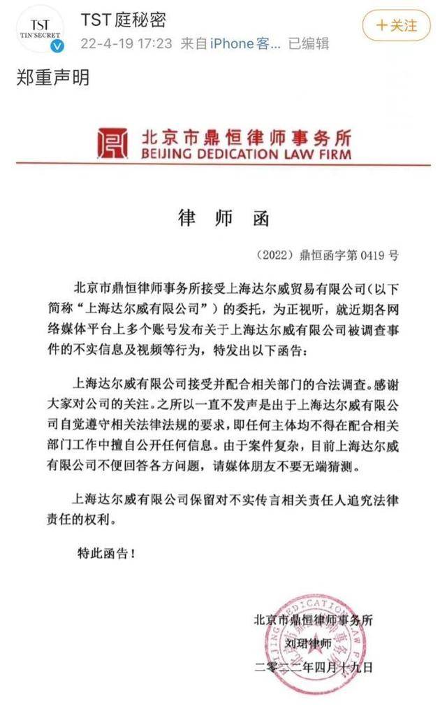 4月19日17时23分,@TST庭秘密的官方微博更新了一则律师函,称上海达尔威接受并配合相关部门的合法检查。“之所以一直不发声是出于上海达尔威自觉遵守相关法律法规的要求。由于案件复杂,目前上海达尔威不便回答各方问题,请媒体朋友不要无端猜测。”