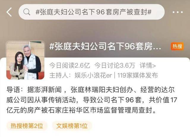 4月19日午时,“张庭夫妇公司名下96套房产被查封”话题登上微博热搜,引发网友热议。据悉,由于涉嫌传销行为,上海达尔威名下的96套房产已于去年7月被查封。