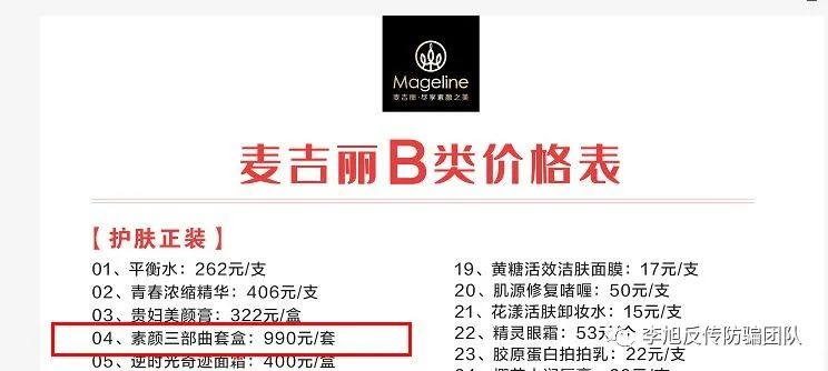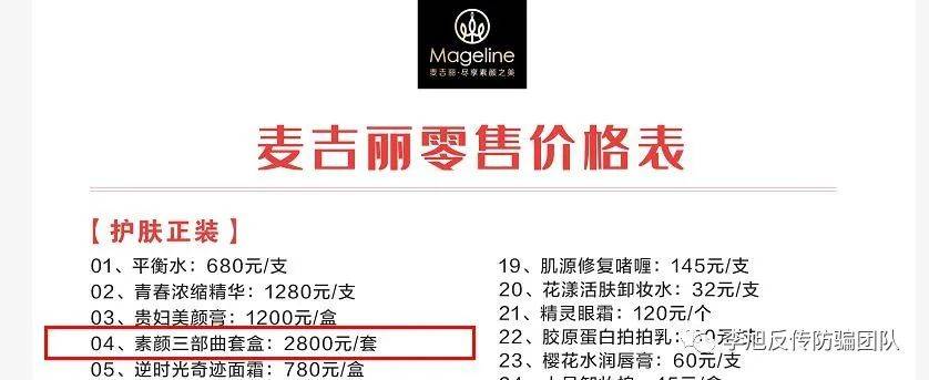 而我们对比麦吉丽正装价格表和一级代理商进货报价表,看到两者之间溢价巨大。比如青春浓缩精华素,官方售价为1280元/支,总监进货价仅为326元/支,B类经销商拿货价406元/支;贵妇美颜膏官方售价1200元/盒,一级代理商进货价仅为192元/盒,B类经销商进货价322元/盒。