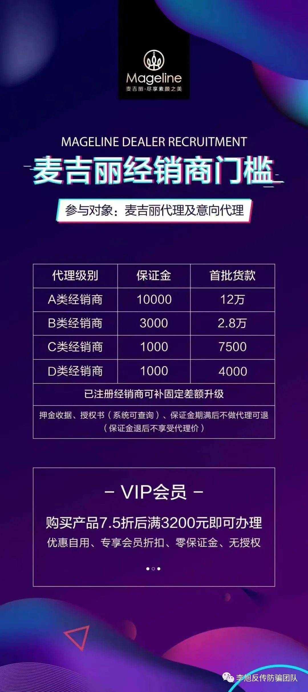 很多经销商就想到自己在网上去卖吧,通过电商平台。那也是不行的,麦吉丽公司有一个零售指导价,你必须按照零售指导价去卖,也就是要么你招到代理商,交押金办代理商,以代理商价格卖给下家,要么就是以零售指导价去卖,否则查到你低价卖货就要被罚款,扣押金。