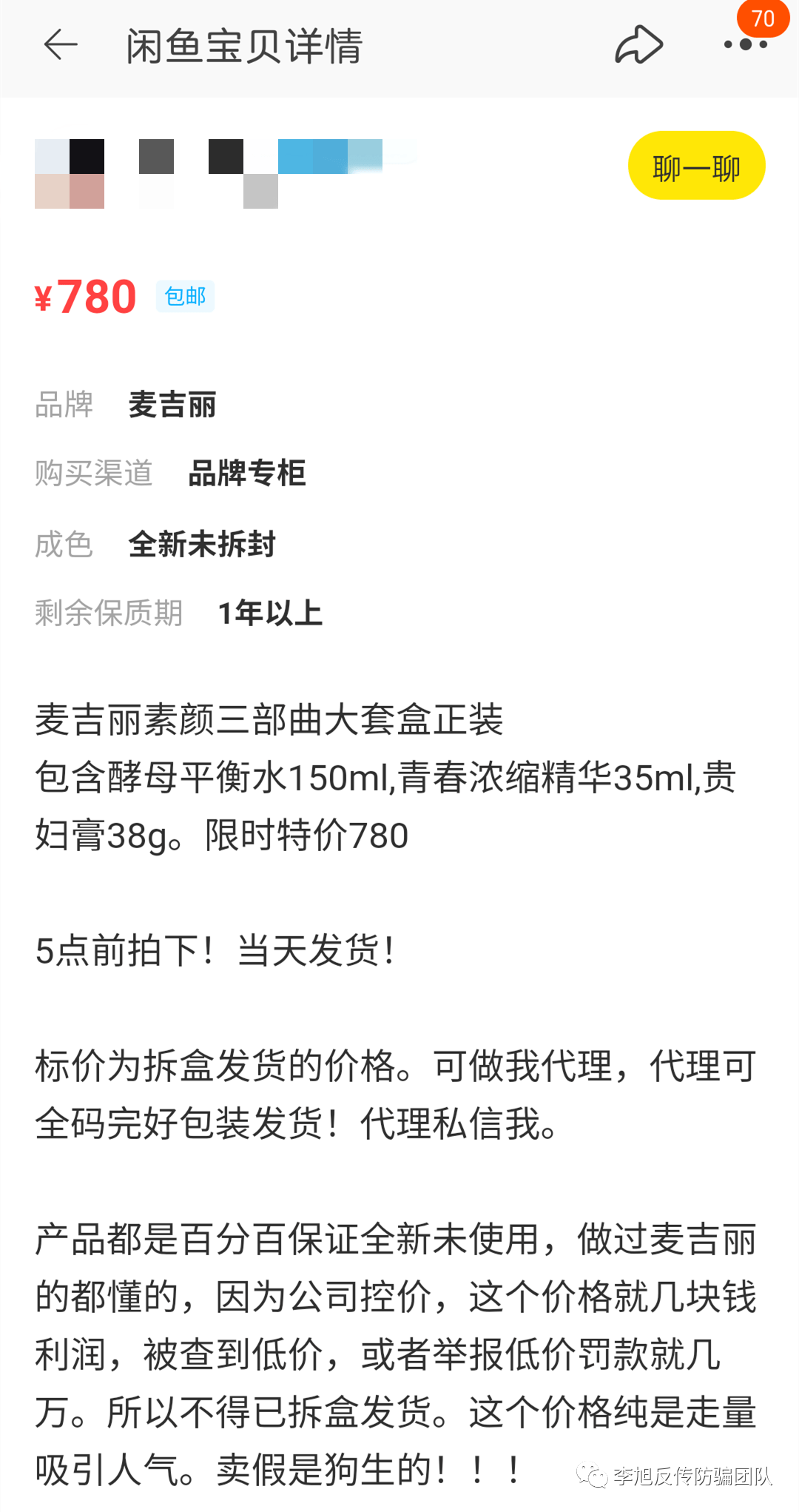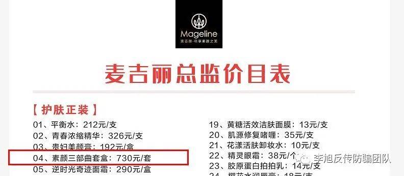 举个例子,一套素颜三部曲官方售价是3160元,总监的拿货价是730元,闲鱼上的卖价是800左右,但是你如果做麦吉丽的B类经销商,拿货价是990元。(也有网友质疑,这一套素颜三部曲的成本价格才不到95元)