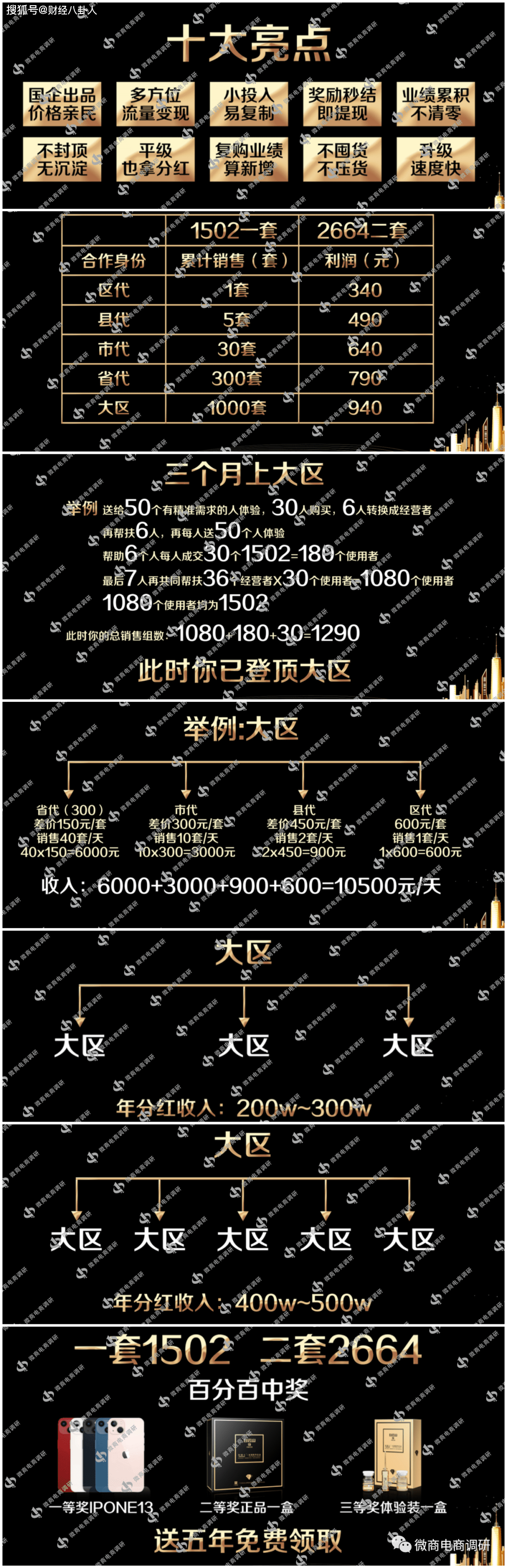 接下来,我们再来关注一下拜博士推行的奖金制度该如何解读。据推广人员阿庆(化名)介绍,拜博士产品1套1502元,两套2644元。销售一套为区代,累积销售5套升级为县代,累积销售30套升级为市代,累积销售300套升级为省代,累积销售1000套升级为大区。具体收益来源详见如下资料: