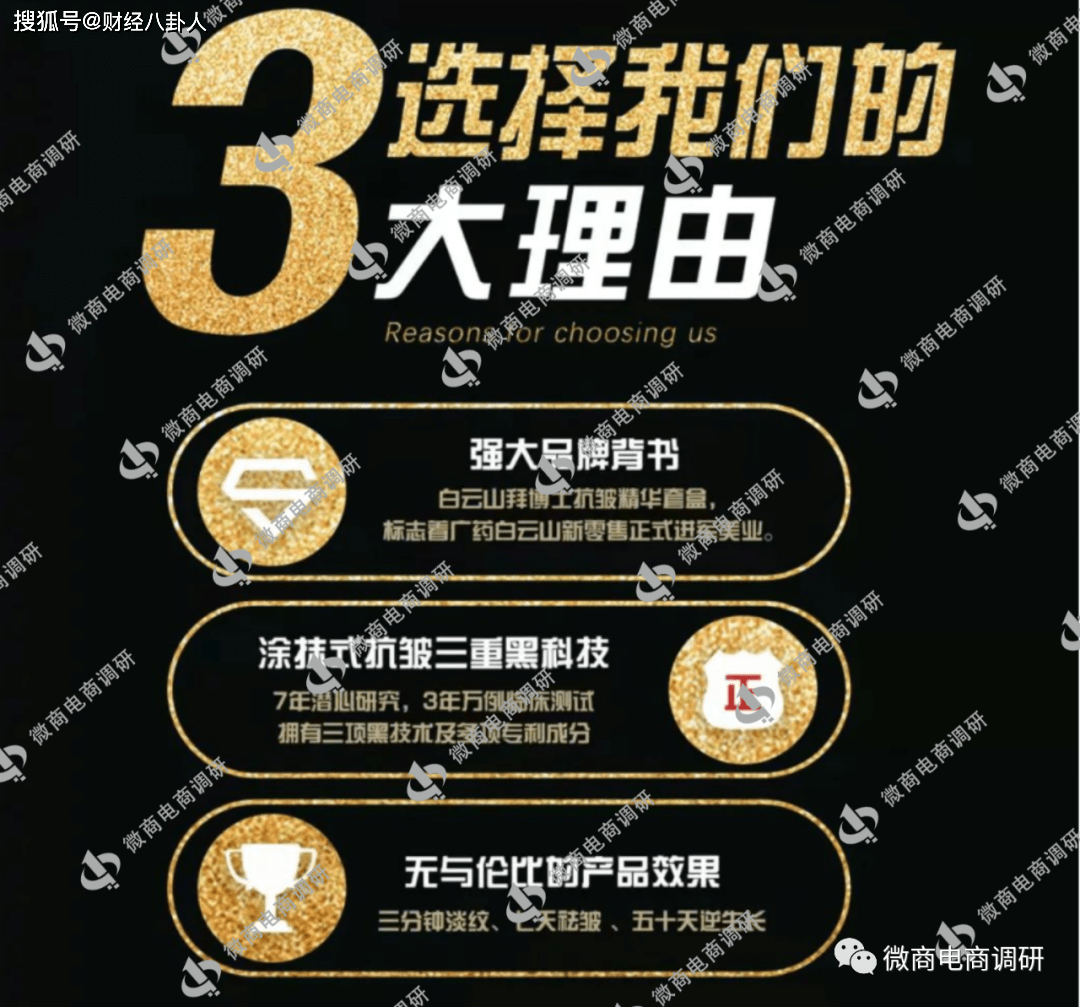 那么拜博士这个项目到底有着怎样的平台背景?白云山拜博士与“减龄新零售”有何关联?白云山拜博士抗皱精华套盒是否存在明示或者暗示医疗作用的广告内容?“三分钟淡纹,七天祛皱,五十天逆生长”的说法从何而来?这个项目所推行的奖金制度真的具有“不封顶、无沉淀、平级也拿分红、业绩累积不清零”等特点吗?