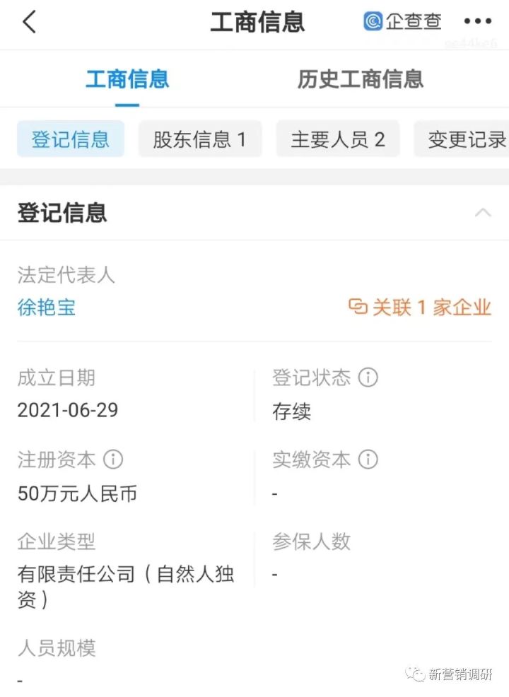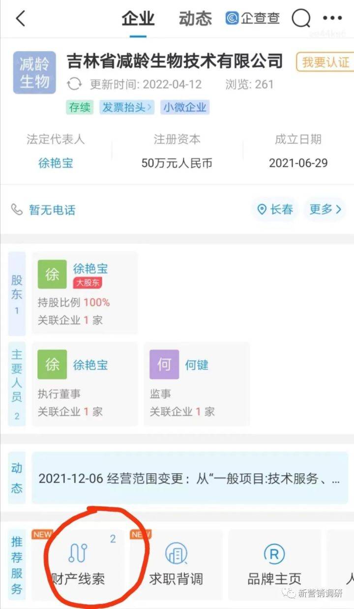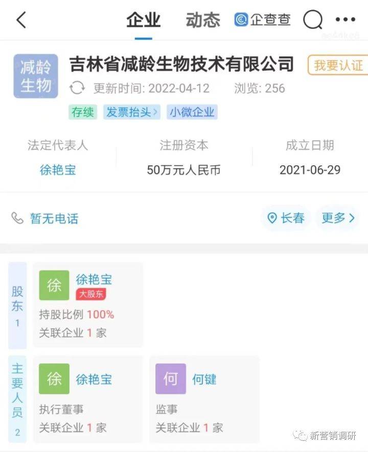 企查查显示:吉林省减龄生物技术有限公司-成立日期是:2021年6月,法定代表人:徐艳宝,为一人独资企业,徐艳宝一人持股100%,注册资金50成,实缴为0元,参保人数为0人,呵呵~不禁让人怀疑又一个空壳公司。