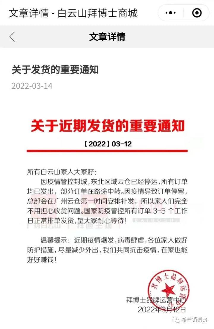 在2022年3月份的白云山拜博士商城的一篇《关于发货的重要通知》中出现了:拜博士运营中心 的圆章,此章是否得到授权与在主管部门备案,会进一步核实。