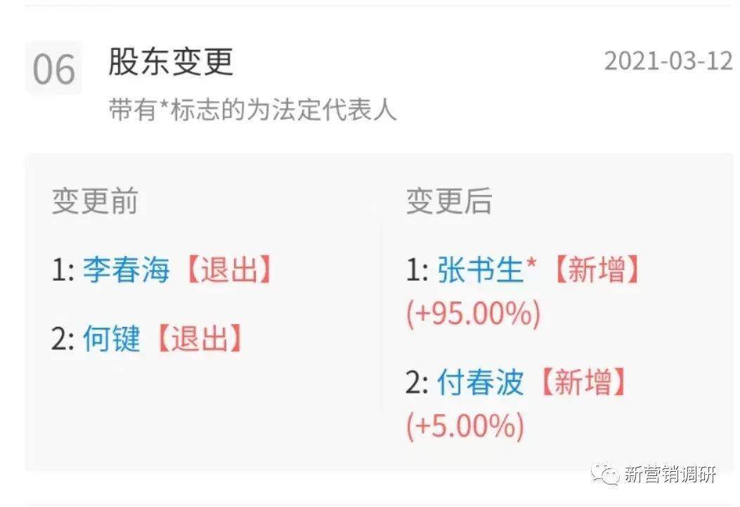 同时减龄新零售(广州)有限公司在去年2021年的3月发生过一次股东变理,变更前的股东分别为:李春海,持股95%,何键持股5%。