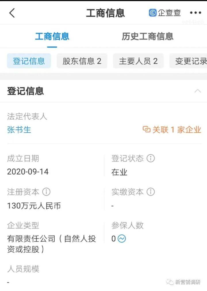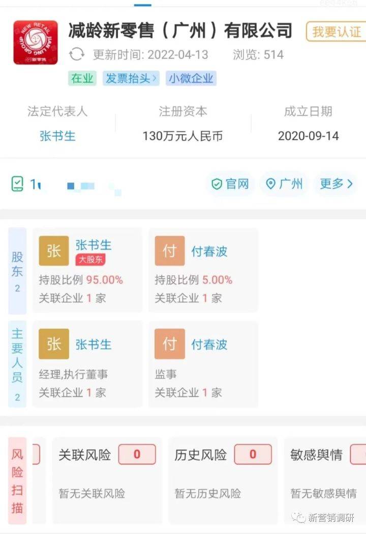 企查查显示:减龄新零售(广州)有限公司-成立于2020年9月,法定代表人:张书生,两大股东:张书生持股95%,付春波持股5%;注册资本130万,实缴与参保人数为0人。