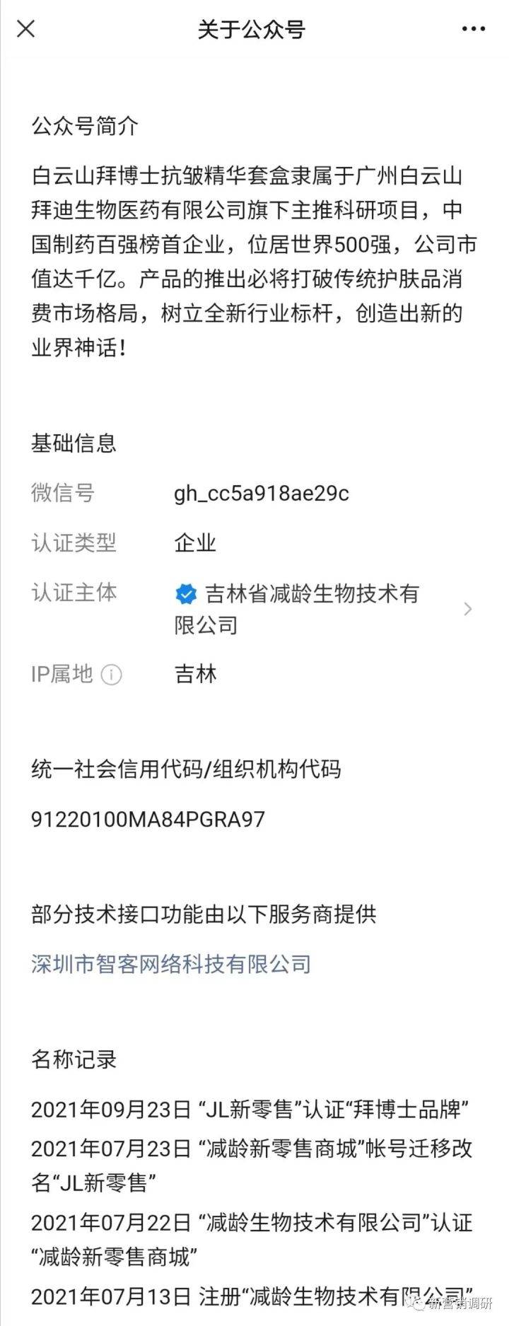通过连接商城的公众号显示认证主体为:吉林省减龄生物技术有限公司。