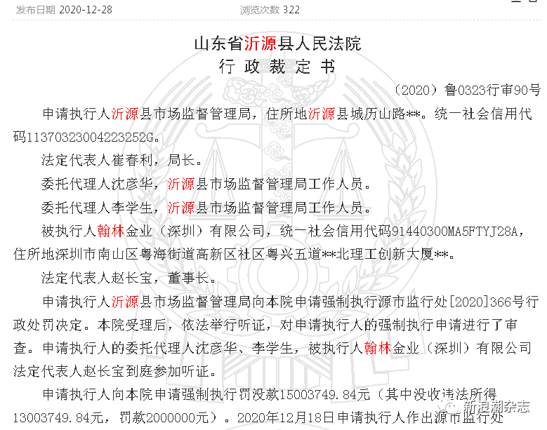 第三则裁定书显示,2020年12月18日,沂源县市场监督管理局对翰林金业做出如下处罚:1、没收违法所得13003749.84元,上缴国库;2、罚款2000000元,上缴国库;1、2项罚没款合计15003749.84元”的行政处罚,逾期不缴纳罚款每日按罚款数额的3%加处罚款等履行方式。