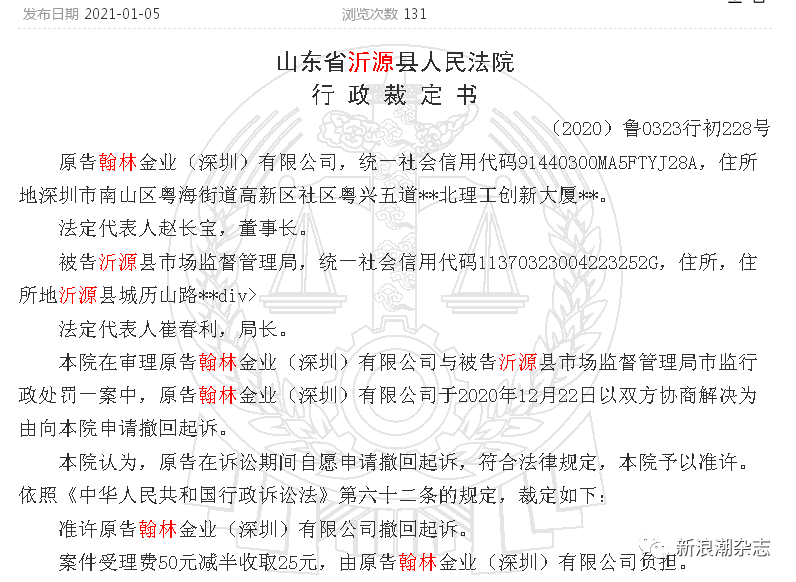 翰林金业对沂源县市场监管局提起行政诉讼,而沂源市场监管局也向法院申请强制执行。2020年12月22日,翰林金业以双方协商解决为由向沂源县人民法院申请撤回起诉,并获得法院准许。第二日,也就是12月23日,沂源县人民法院对沂源县市场监督管理局申请强制执行罚没款15003749.84元案做出裁定,准予强制执行。通过听证,翰林金业对沂源县市场监督管理局作出的处罚决定没有任何异议,表示愿意缴纳罚没款。