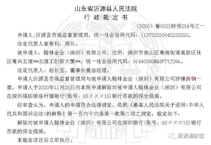 第二则裁定书由法院于2020年11月27日发布,根据沂源县市场监督管理局的申请,沂源县人民法院同意解除此前对翰林金业相关账户的保全措施。
