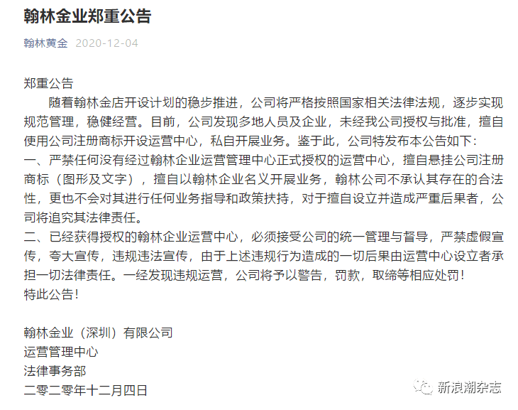新浪潮记者注意到,在翰林金业案件处理期间,2020年12月4日,其官方微信公众号发布一则郑重公告,称严禁任何没有经过翰林企业运营管理中心正式授权的运营中心,擅自悬挂公司注册商标(图形及文字),擅自以翰林企业名义开展业务,翰林公司不承认其存在的合法性,更也不会对其进行任何业务指导和政策扶持,对于擅自设立并造成严重后果者,公司将追究其法律责任;已经获得授权的翰林企业运营中心,必须接受公司的统一管理与督导,严禁虚假宣传,夸大宣传,违规违法宣传,由于上述违规行为造成的一切后果由运营中心设立者承担一切法律责任。