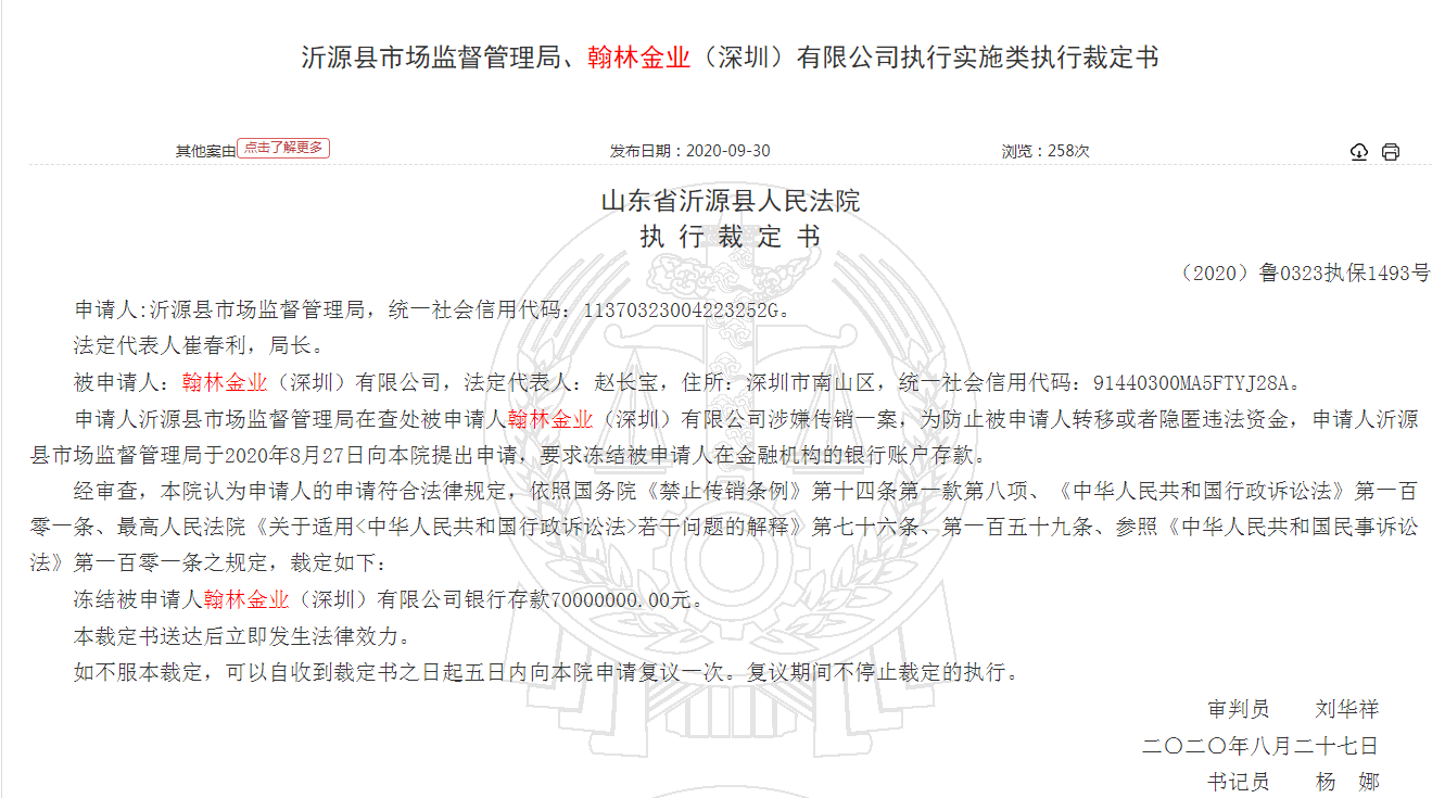 近日,中国裁判文书网披露《沂源县市场监督管理局、翰林金业(深圳)有限公司执行实施类执行裁定书》显示,山东沂源县市场监督管理局在查处翰林金业(深圳)有限公司(简称“翰林金业公司”)涉嫌传销一案时,为防止后者转移或隐匿违法资金,于2020年8月27日向沂源县人民法院提出申请,要求冻结翰林金业公司在金融机构的银行账户存款。