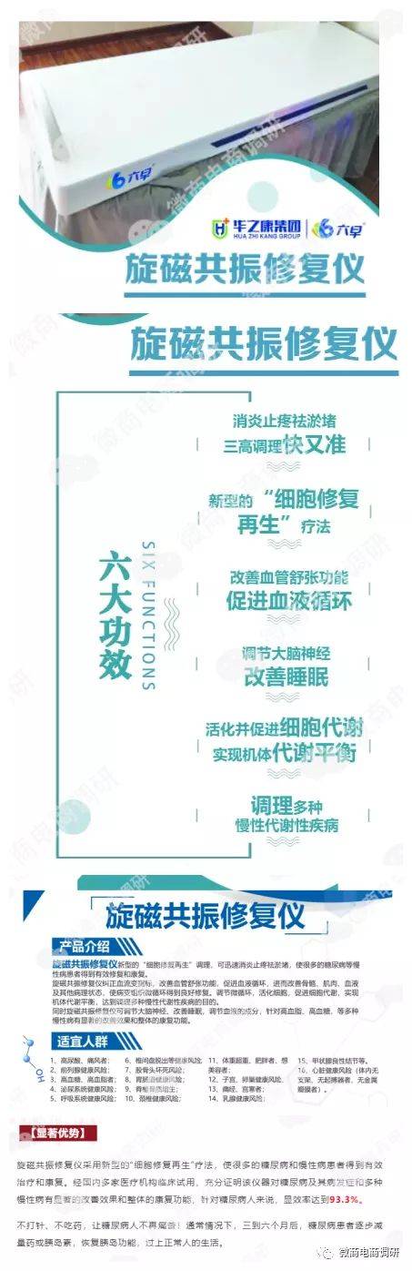 除了这款试剂之外,江苏华之康的代理们还宣称其产品旋磁共振修复仪能够调节微循环,增强组织细胞与血液物质交换,从而促进组织细胞的新陈代谢;能调节大脑神经,改善人体的脑部组织细胞及神经系统的功能;还能调节血液成分,针对高血脂、高血糖等多种慢性病有显著的改善效果和整体的康复功能,不打针、不吃药,让糖尿病患者逐步减量药或胰岛素,恢复胰岛功能,过上正常人的生活。