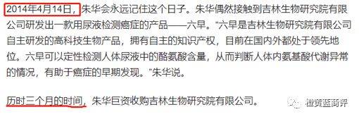 该文指出了朱华是2014年4月14接触到吉林生物研究院有限公司研发出一款用尿液检测癌症的产品——六早,随后花了三个月的时间,朱华巨资收购吉林生物研究院有限公司。