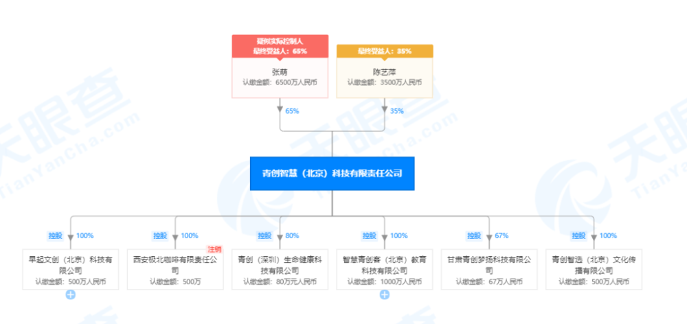 据天眼查APP显示,青创智慧(北京)科技有限责任公司(曾用名:极北咖啡(北京)有限责任公司)成立于2015年4月23日,实缴资本 500万元,杨海涛担任法人、经理,执行董事,该公司最大股东是张萌,持股65%。