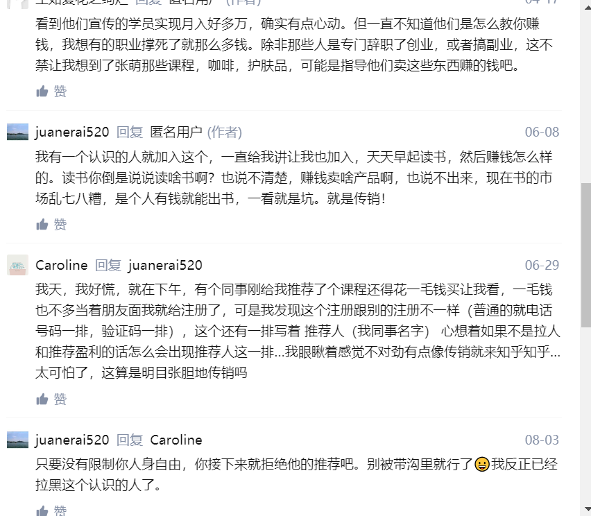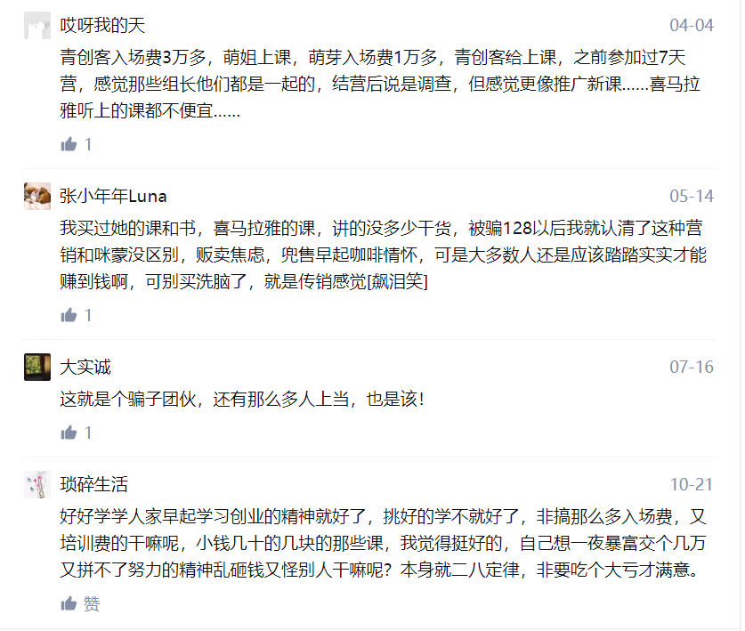 还有网友表示:“我感觉她们就是一种高级传销,口号喊的怪响,三天的课程,每天就三四个小时,除了张萌自己讲俩小时,其他都是成功学员分享,什么疫情在家一个月赚21万,三个月躺赚50万,什么时间管理让你每天工作17个小时不觉得累……”