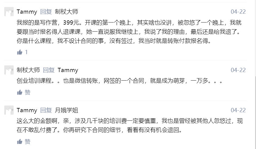 “又是一个被洗脑的,我刚退课课,之前报了一个写作营,第一节课不停地顺她的学员有多成功,搞神呢同桌,微博要互评,班级要选班长宣传委员峰,拜托!我是来学习课程,说这些有的没的,假道不行,大家小心被骗了。她们这个套路就是高级传销,应该是通过这种课程拉人头让你去入会,然后入卖产品。我是做保险销售,这种套路一看就知道了。大家千万要有自己的判断能力,钱都是靠血汗钱赚的,很不容易的。”某网友说道。