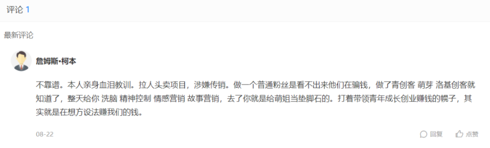 此外,在天眼查留言区有网友咨询“该公司靠不靠谱?”,有网友回复道:“不靠谱。本人亲身血泪教训,拉人头卖项目,涉嫌传销。做一个普通粉丝是看不出来他们在骗钱,做了青创客、萌芽、洛基创客就知道了,整天给你洗脑,精神控制,情感营销,故事营销,去了你就是给萌姐当垫脚石的,打着带领青年成长创业赚钱的幌子,其实就是在想方设法赚我们的钱。”