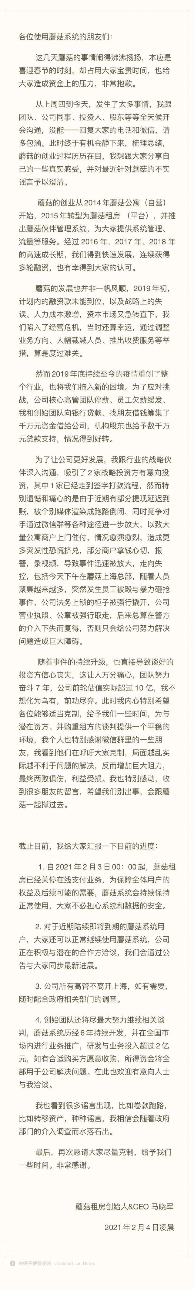 2月4日凌晨,通过其员工,蘑菇租房创始人兼CEO马晓军给房东方发出公告,表示由于2019年初融资未到位,加上战略失误、人力成本激增,公司陷入经营危机;受疫情影响,公司核心团队停薪、员工欠薪缓发、创始团队向银行贷款、向朋友借款筹资了千万元加上机构股东贷款支持。