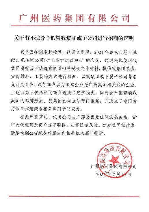 7月13日,广药集团在其官网发布一则声明,称“2021年以来巿场上陆续出现多家公司以‘王老吉运营中心’的名义,通过违规使用我集团商标甚至伪造我集团相关授权文件材料,模仿我集团装潢、宣传材料、工装等方式进行招商,以我集团或下属子公司等名义开展业务,误导商户以为该类企业是广药集团相关联的企业。”