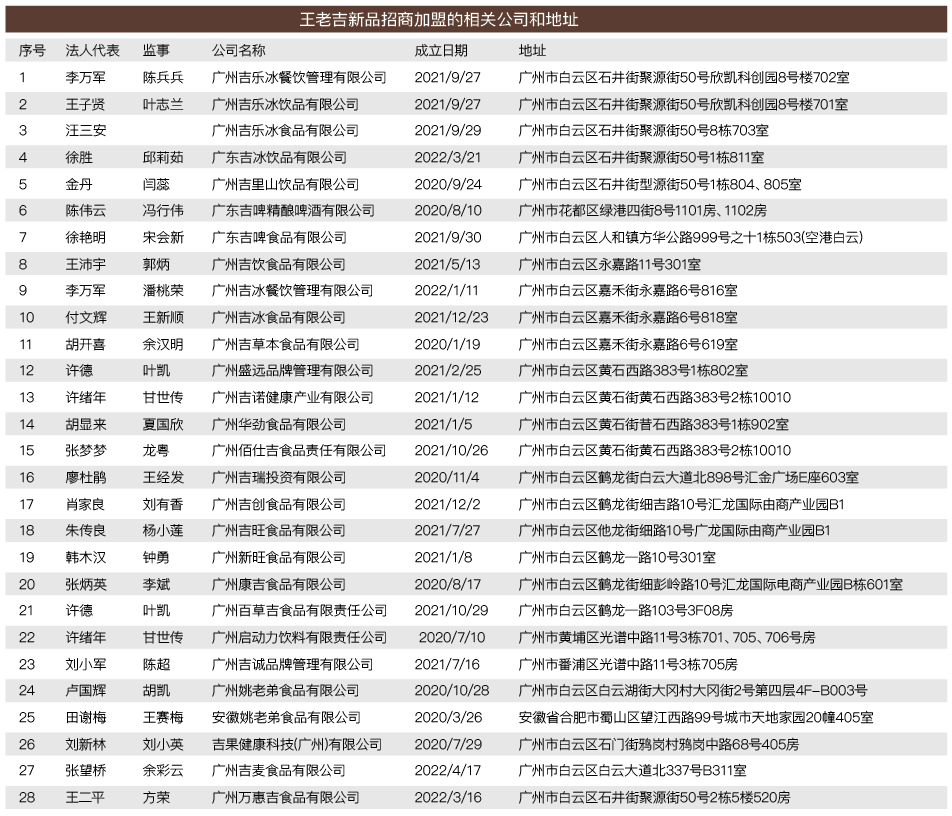 目前市场上出现的以“王老吉”名义招商的公司,手中的授权大多来自广州创赢公司。天眼查显示,广州创赢公司是由白云山公司出资于2019年8月成立,是白云山全资子公司。该公司官网信息显示,其主要负责整合集团所有品牌无形资产的资源,通过创赢公司对品牌的授权、合作产品及品牌合作项目进行统一梳理和统筹,实现品牌一体化、品牌(资产)运营、专利和著作权等知识产权虚拟创赢,实现品牌增值,使知识产权价值显性化,推动集团高质量发展。