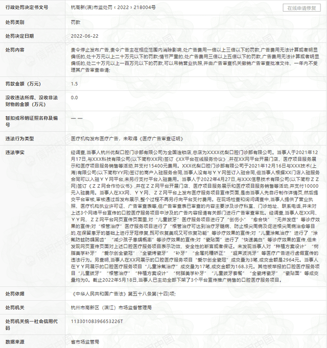日前,信用中国上公布了一则行政处罚信息,杭州优梨口腔门诊部有限公司因未取得《医疗广告审查证明》被杭州市高新区(滨江)市场监督管理局罚款1.5万元。