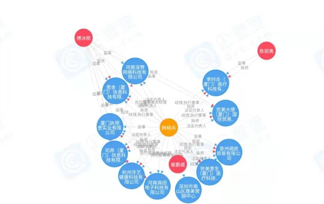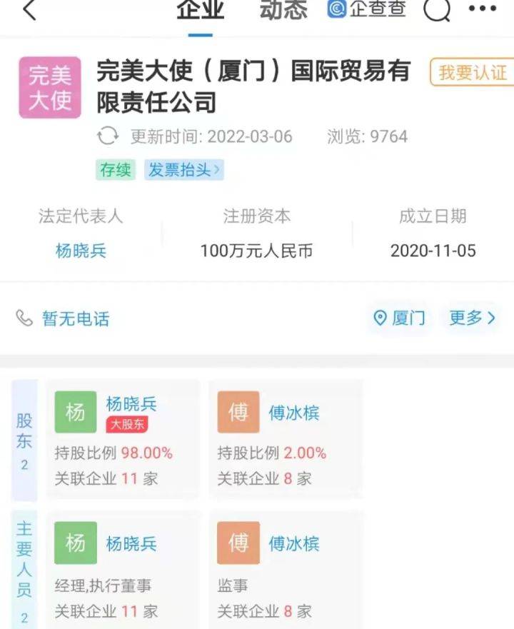 通过官方小程序显示:其主体公司为:完美大使(厦门)国际贸易有限公司;法定代表人:杨晓兵,同时占股98%,傅冰槟持股2%,成立于2020年11月,注册资本金100万,实缴-,参保人数为0人,看来此次学乖了,并没有牵扯过多的公司参与;与此同时法定代表人:杨晓兵的关联公司高达11家企业,如下图所示: