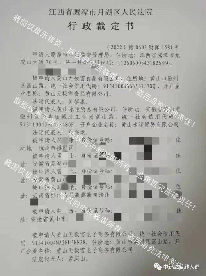 近日,中新融媒接到知情人透露,江西省鹰潭市市场监督管理局在查处黄山无极雪食品有限公司涉嫌传销以及关联方黄山永运贸易有限公司、吴黎康、孟庆山、曹某飞、马某艳、钟某汝、黄山无极雪电子商务有限公司、黄山聚信控股有限公司一案中,为防止被申请人转移或隐匿违法资金,于2022年4月20日向江西省鹰潭市月湖区人民法院提出申请,要求对被申请人在金融机构使用的账户予以冻结,共计冻结金额额度为147000000元。
