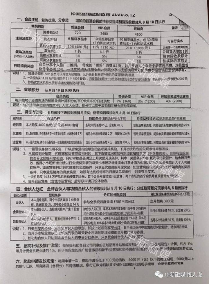 那么,以上公司以及关联人员为何会涉嫌传销呢?据悉,“黄山无极雪”奖励制度(又称:《体验营销励政策2020.8.12》) 如下: