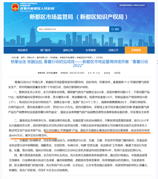 “某公司涉嫌以‘芦笋植萃’产品、虚拟币为道具从事违法经营活动立案调查,依法冻结涉传资金6000万元,案件正在办理当中。”