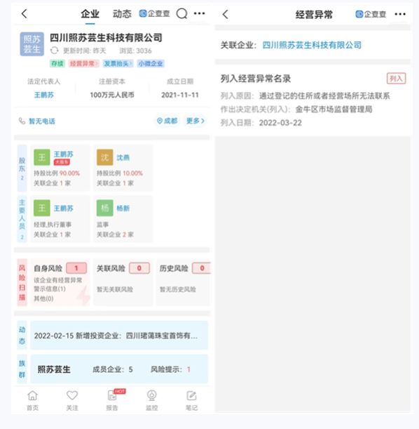 据企查查发现,四川照苏芸生科技有限公司成立于2021年11月11日,法定代表人为王鹏苏,注册资本100万元人民币,实缴资本0元,而该公司却在2022年3月22日被金牛区市场监管局以“通过登记的住所或者经营场所无法联系”为由,列入了经营异常名录。