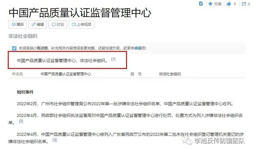 返回百度搜索,我们注意到,曾经有一家中国产品质量认证监督管理中心(跟中国质量认证监督管理中心就两字之差)被列为非法社会组织。