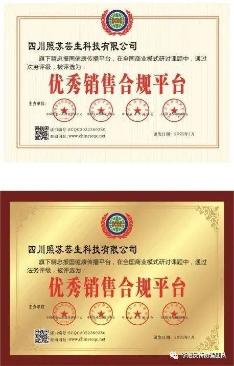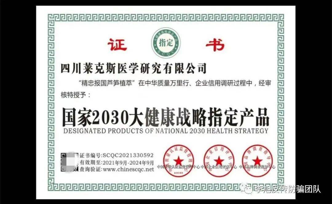 这是国家2030大健康战略指定产品的证书,是颁发给四川莱克斯医学研究有限公司。证书中显示查询验证的网址为:www.chinescqc.net 发证单位有中国质量认证监督管理中心、中国企业信用评估中心、中国品牌调查指导中心。