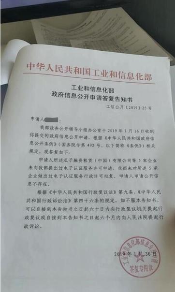 但是在与消费者沟通投诉的细节时,一份来自中华人民共和国工业和信息化部的政府信息公开申请答复告知书,引起了本网站工作人员的关注。告知书中表示瓜子融资租赁(中国)有限公司等5家企业并未向工信部提出过电子认证服务许可申请。那么告知书中提到的“电子认证服务许可”到底是什么?