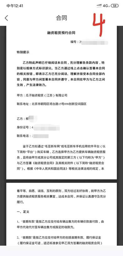 随后,柳女士向当地门店缴纳了该车的3成首付38940元及3000元履约保证金。在付款当晚,柳女士在毛豆APP上核实相关合同,发现APP上显示两份合同,即前文提到的融资租赁预约合同及告知书。告知书中“首年为租赁形式,消费者仅有使用权而无所有权”的内容更让柳女士感到被欺骗。