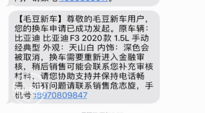 消费者徐先生:“下午毛豆新车网的人就联系我女朋友,去我女朋友公司,给她做了测试贷款额度,以一辆最低价格的比亚迪的车做的测试,为的是更容易通过贷款申请,让我女朋友办了一个申请。”