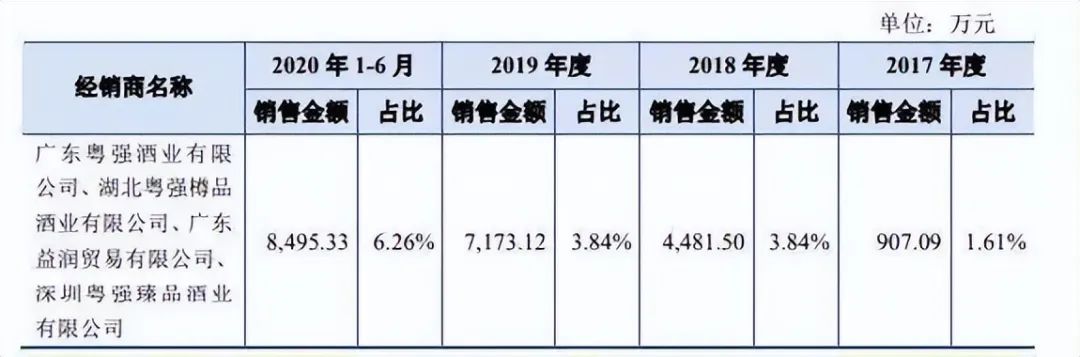 招股书显示,国台酒业2019年度前五大经销商中,除了第一名是控股股东天士力旗下公司,其余的皆是各地大商。位居经销商第二名的广东粤强酒业及其关联公司,2017-2019年销售金额分别为907.09万元、4481.5万元、7173.12万元,分别占当期营业收入的1.61%、3.84%、3.84%。
