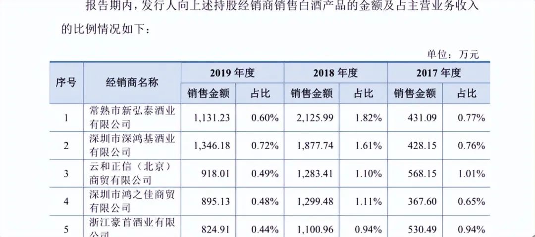 2017-2019年,这102家经销商贡献的销售金额合计分别为2.72亿元、5.46亿元、6.05亿元,分别占当期营业收入的48.36%、46.84%、32.35%。这种与经销商深度绑定的关系,无疑给国台酒业的销售带来很大动力,这正是其业绩狂飙的重要原因。