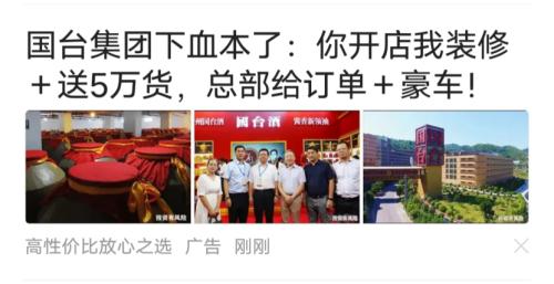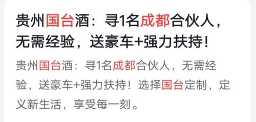 与此同时,深蓝财经在多个平台看到,国台酒的招商广告铺天盖地。而且内容极具诱惑力:无需经验,送豪车,强力扶持,不压货,1人可做。白酒经销的门槛,已经这么低了吗?