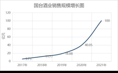 公开数据显示,2017年-2020年,国台酒业分别实现总营收5.73亿、11.77亿元、18.88亿、40.05亿。在1月9日举办的国台“2022年全国经销商代表大会”上,国台酒业披露,公司2021年含税销售额跃升至百亿规模,实现了销售的爆发式、跨越式翻番增长。