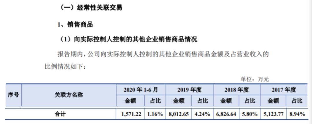 2017至2019年,国台酒业向关联企业销售商品金额分别为5123.77万元、6826.64万元、8012.65万元;占营业收入的比例分别为8.94%、5.8%、4.24%。2020年上半年,这一金额为1571.22万元,占比为1.16%。
