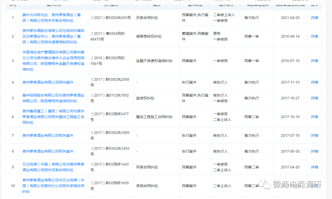 茅泉酒业公司的相关法律诉讼(部分)2016年到2017年,茅泉酒业公司五度被贵州省仁怀市人民法院列为失信被执行人。2017年4月,茅泉酒业因拒不支付给日立电梯(中国)有限公司的53700元电梯安装尾款而被诉至法院,同月又因拖欠瀚华担保股份有限公司4103085.75元被法院列为执行人。2017年7月,茅泉酒业因拖欠鲁班建工有限公司工程款844963元拒不付款而被诉至法院。2018年3月,茅泉酒业因拖欠中国信达资产管理股份有限公司贵州省分公司683.41万元贷款而被诉至法院。